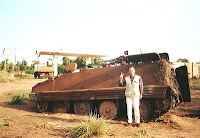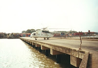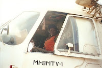 órias do comando exercido por Ansumane Mané, o líder da Junta Militar, de como fazia a logística da Junta Militar no seu helicóptero voando rente à copa das árvores, de como assustara os senegaleses fazendo descolar um MIG (sem nada para o armar) só para os assustar com o barulho, ligando-lhes a post-combustão na vertical (parece que surtiu efeito, eles revelaram alguma desorientação...) Enfim, foi realmente uma tarde magnífica, que terminou com uma volta de helicóptero, sobrevoando Bissau, com partida do porto. Fotografei tudo: podem ver a chegada ao porto, o heli, o Manel aos comandos, no seu cockpit, a sombra do heli, o ilhéu do Rei, o porto de Bissau, o então jovem segurança do Melcíades... Também me podem ver a mim, frente ao famoso poilão (árvore) de Brá e f