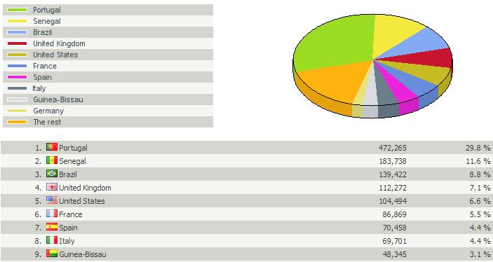 Segui o link para as estatísticas do Didinho por países e constatei que os acessos com origem na Guiné são muito escassos, pouco passando de 3%. Ou seja, os(as) frequentadores(as) assíduos(as) da «oferta» de informação on-line relativa à Guiné-Bissau são, na sua esmagadora maioria, pertencentes à Diáspora.Mas o mais interessante é o padrão de dispersão, por todo o mundo, da Diáspora. Há guineenses pelo mundo inteiro: sem ser necessário clicar, basta contemplar um pouco os contadores / globo do site do Didinho, para o perceber. A Guiné-Bissau é sem dúvida não só um povo maximamente diverso (etnias por quilómetro quadrado), como também disperso!